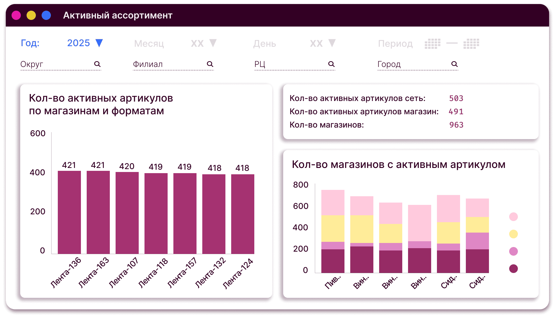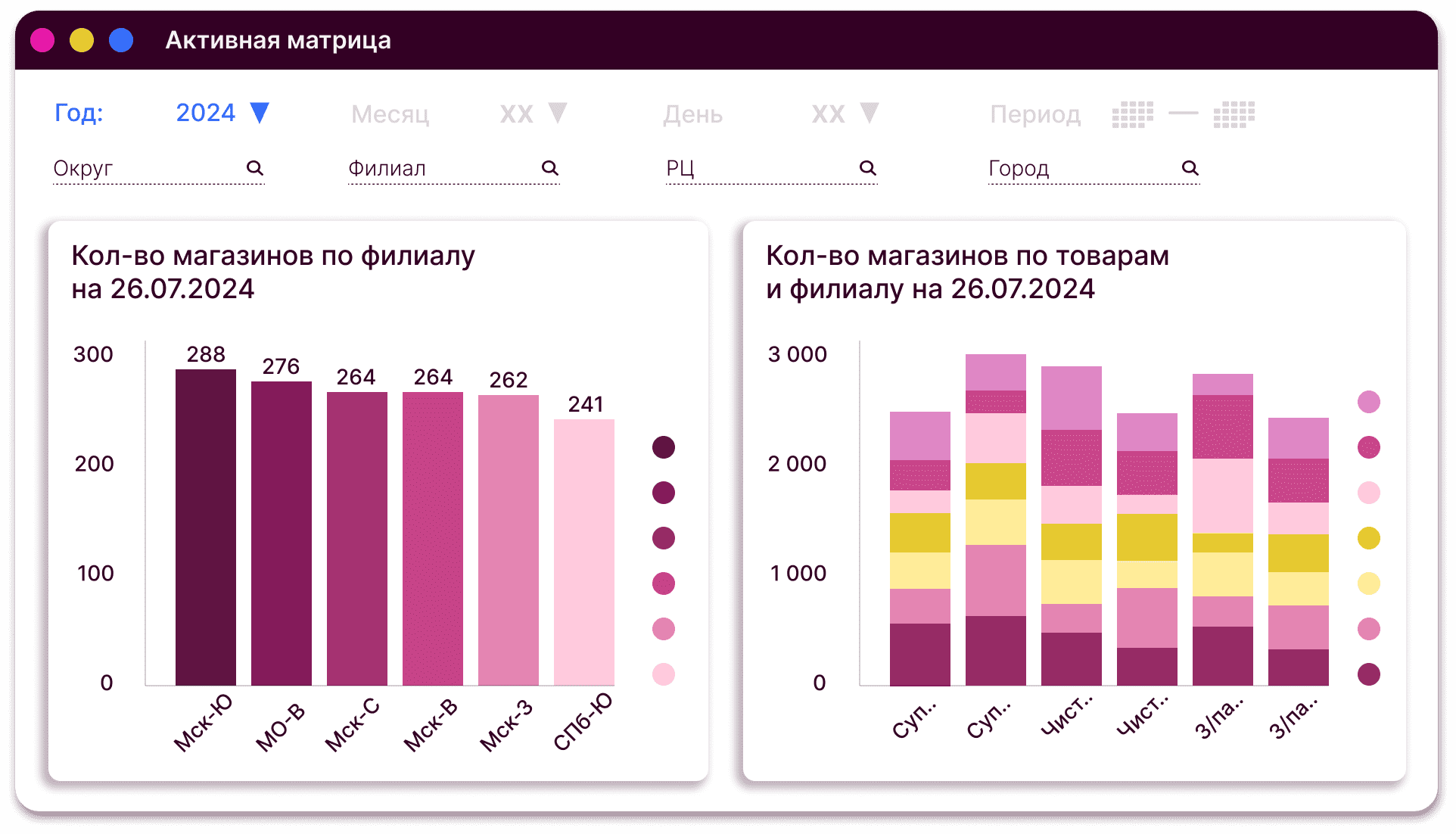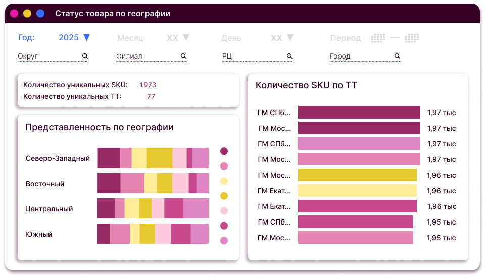 Дистрибуция по географии/форматам ТТ/количеству в динамике